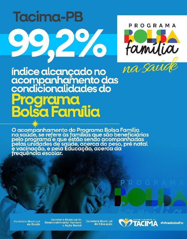 O município de Tacima-PB conquistou um importante resultado ao atingir 99,2% de acompanhamento das condicionalidades do Programa Bolsa Família, um marco que reforça o compromisso da gestão municipal com o cuidado, a saúde e a educação das famílias beneficiárias.