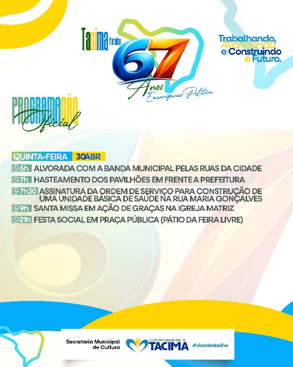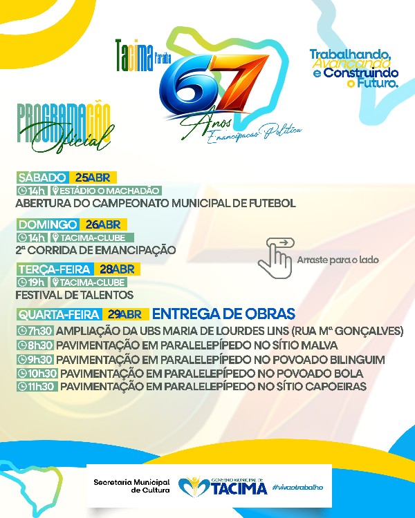 A Prefeitura de Tacima divulgou a programação oficial em comemoração aos 67 anos de Emancipação Política do município. A agenda reúne uma série de atividades esportivas, culturais, religiosas e inaugurações de obras, reforçando o compromisso da gestão com o desenvolvimento e o bem-estar da população.
