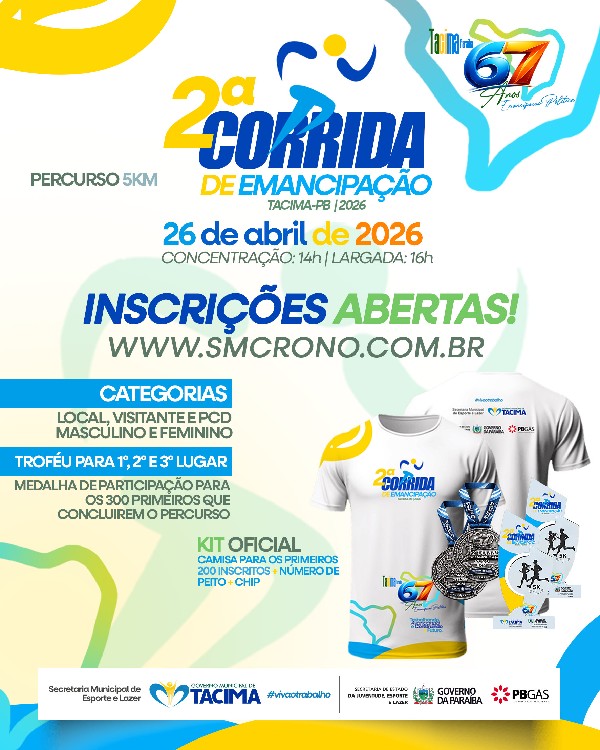 A Prefeitura de Tacima, por meio da Secretaria Municipal de Esporte e Lazer, anuncia a realização da 2ª Corrida de Emancipação, um evento esportivo que promete movimentar atletas e entusiastas da região.