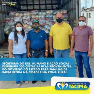 A Secretaria de Estado do Desenvolvimento Humano, em atenção ao Ofício encaminhado pela Secretaria Municipal do Desenvolvimento Humano e Ação Social, encaminhou 300 cestas básicas para doação.Tais cestas foram doadas tanto na zona urbana quanto na zona rural do município de Tacima-PB.Receberam as cestas básicas, famílias que se adequam ao perfil vulnerabilidade social, dentre elas algumas que tinham gestantes, pessoas idosas, pessoas com deficiência; bem como famílias compostas por trabalhadores com vínculo informal que tiveram perda/redução de renda mensal nos últimos meses.